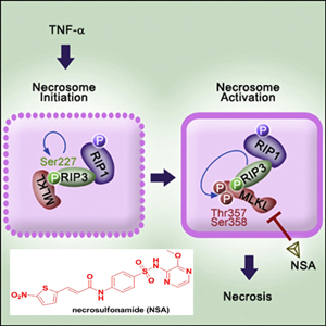 The receptor-interacting serine-threonine kinase 3 (RIP3) is a key signaling molecule in the programmed necrosis (necroptosis) pathway. This pathway plays important roles in a variety of physiological and pathological conditions, including development, tissue damage response, and antiviral immunity. Here, we report the identification of a small molecule called (E)-?N?-(4-(?N?-(3-methoxypyrazin-2-yl)sulfamoyl)phenyl)-3-(5-nitrothiophene-2-yl)acrylamide?-hereafter referred to as necrosulfonamide?-that specifically blocks […]