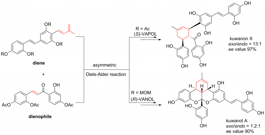ABSTRACT: The first enantioselective total syntheses of?(?)-kuwanon X, (+)-kuwanon Y, and (+)-kuwanol A have been accomplished by using asymmetric Diels?Alder cycloaddition promoted by chiral VANOL or VAPOL/boron Lewis acid. The biosynthesis-inspired asymmetric Diels?Alder cycloaddition shows high exo selectivity (exo/endo = 13/1), which was unprecedented in the previous total syntheses of related prenylflavonoid Diels?Alder natural products. […]