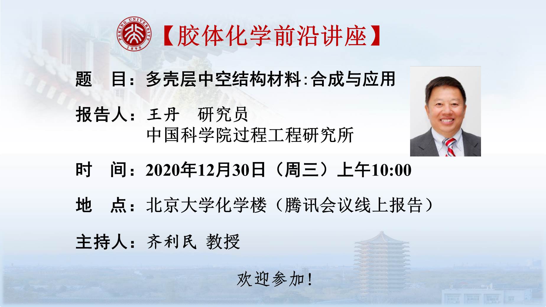 王丹,中国科学院过程工程研究所研究员、博士生导师,中科院“百人计划”入选者,国家杰出青年科学基金获得者,享受国务院特殊津贴专家,中组部“万人计划”科技创新领军人才入选者,科技部中青年科技创新领军人才入选者。英国皇家化学会会士,国际溶剂热水热协会执行委员;《高等学校化学学报》与Chem. Res. Chinese Univ.的执行主编,Mater. Chem. Front.副主编;EnergyChem, Sci. China Mater.和《科学通报》等期刊编委,EES、Adv. Sci., Adv. Mater. Interface, Matter, ChemNanoMat等期刊顾问编委。在Nat. Chem. Rev., Chem. Soc. Rev., Acc. Chem. Res., Nat. Chem.,Nat. Energy, J. Am. Chem. Soc., Angew. Chem. Int. Ed., Adv. Mater.等期刊发表SCI论文170余篇,SCI他引13800余次,H因子55,热点论文2篇,高被引论文28篇。申请发明专利50项,授权27项。2005年获日本陶瓷协会21世纪纪念国际交流个人冠名奖:仓田元治奖;2006年获北京市科学技术奖三等奖;2013年获日本陶瓷协会的日中陶瓷科学技术交流奖励奖;2014年获赢创颗粒学创新奖-优秀科学家奖;2015年获北京市科学技术奖二等奖; 2018年获中国颗粒学会自然科学一等奖; 2018和2019年度科睿唯安“高被引科学家”。主要从事多功能结构体系的合成化学研究:1、中空多壳层结构(Hollow Multishelled Structure, HoMS)的可控合成;2、石墨炔的复合与掺杂调控;3、多组分高效电极体系的应用。