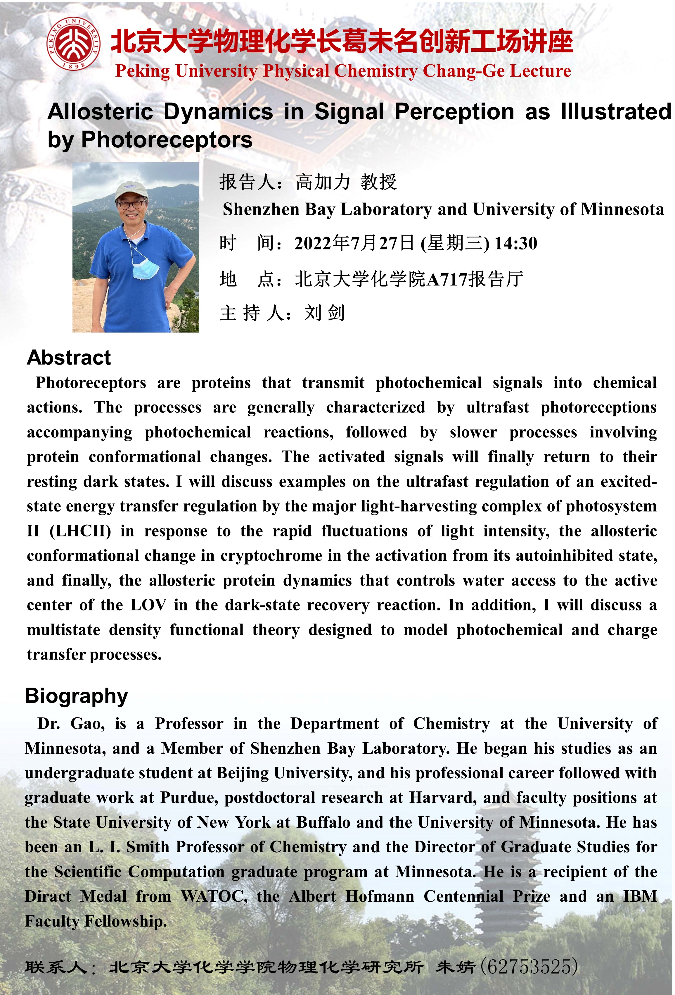 【伟德官方网站物理化学长葛未名创新工场讲座】Allosteric Dynamics in Signal Perception as Illustrated by Photoreceptors