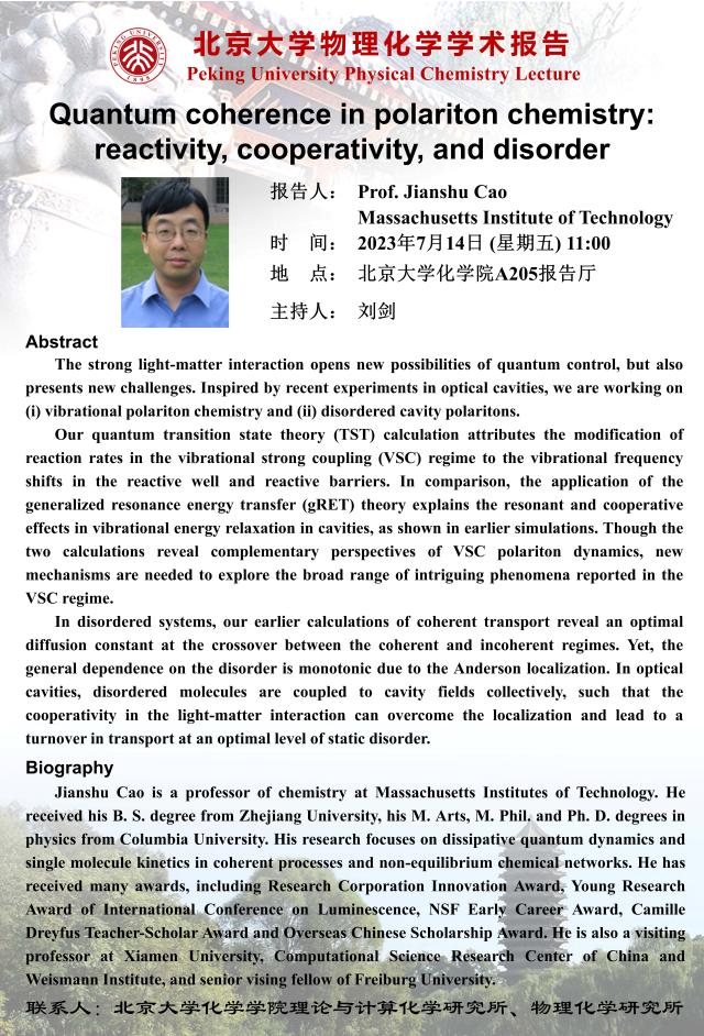 【伟德官方网站物理化学学术报告】Quantum coherence in polariton chemistry: reactivity, cooperativity, and disorder